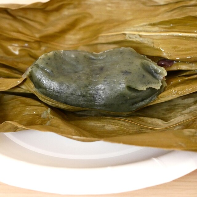 うるち米ともち米をブレンドした笹だんご専用の粉を使った生地を一晩寝かせてから国産よもぎと合わせついたお餅は、もち米を入れることでもちもちとして歯切れのいい独特の食感。あんこは、北海道産小豆を煮詰めた甘さ控えめ粒餡。クマザサより幅が広いチマキザサという笹の葉で包み上げ、い草でぐるぐると巻き蒸しています。蒸したてのお餅はやわらかく絶品です。