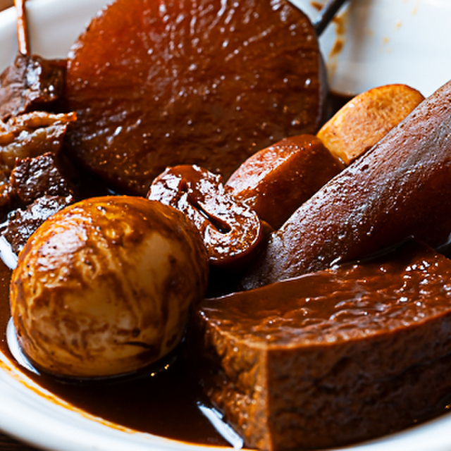 宮崎随一の焼酎の産地としても知られる県南部の都城市は、九州の主要都市の中でも人口あたりのおでん屋さんの軒数が第1位のおでん激戦区です。出汁が染み込んだとろとろの軟骨・”おやし”と呼ばれる豆もやし・ざく切りのキャベツが入るのが都城のおでんの鉄則。おでんの出汁は、鶏ガラをベースにカツオと昆布からとり、ザラメや甘口醤油で仕上げた甘めでコクの深い味わいが都城流のおでんつゆです。おでん屋さんに鍋を持ち込み、テイクアウトするのも昔からの定番になっています。